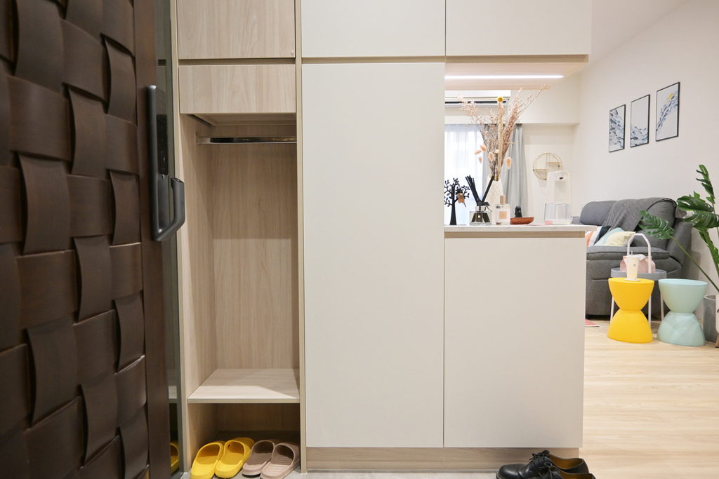 【高雄室內設計推薦】新家開箱:木質調x藕色系~溫馨浪漫的夢想之家│玄關櫃/洞洞板/家電櫃/弧形跳色床背板讓新家處處實用又驚喜!明日喆居室內裝修案例分享