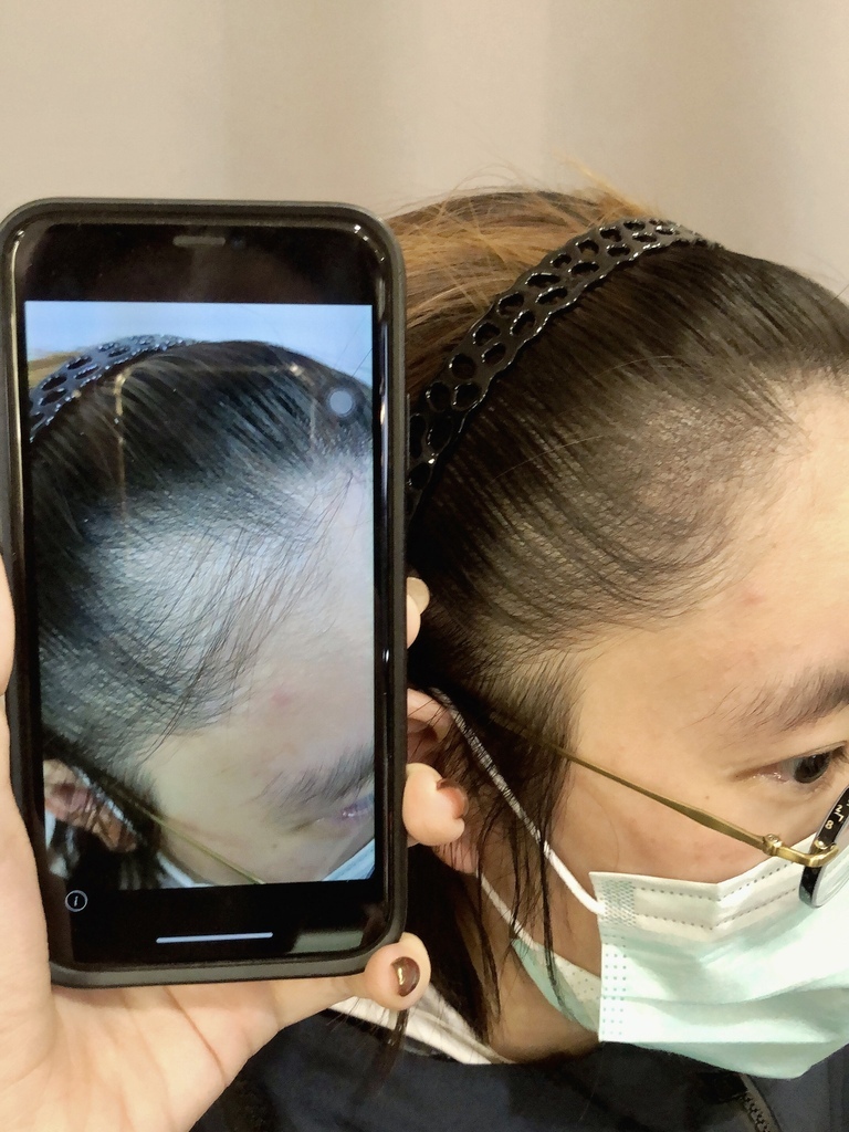 ▼她學了一陣子之後,開始真人操作練習,竟然直接把我抓去當她的真人Model!她說要幫我利用紋髮技術修飾一下額頭髮際線,我生完小孩後瘋狂掉髮,髮際線多了兩側缺口,真的是我的痛啊!我每天照鏡子看到那兩塊都超想哭的,怎麼保養都長不回來。