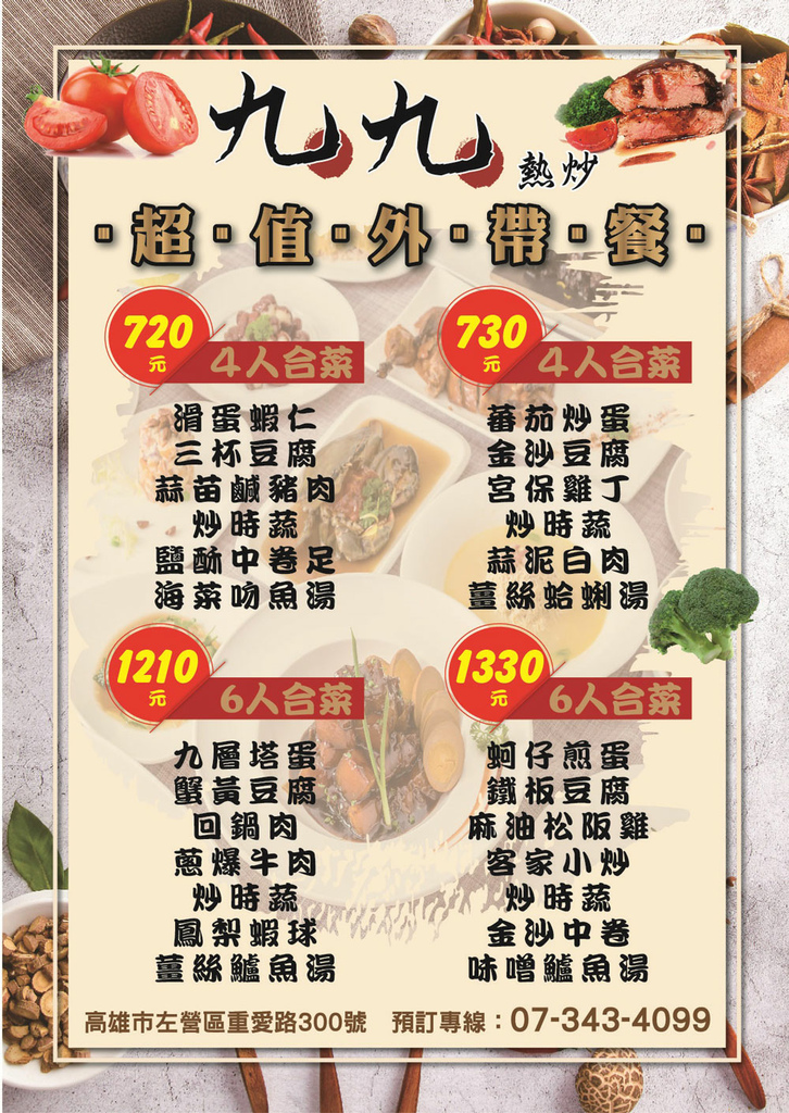 最愛和家人一起去「九九平價家常菜・燒烤」吃飯,位於左營重愛路上,同一條路上也緊鄰多間美食餐廳,主打均一價$99熱炒,每次來都是琳瑯滿座,但礙於疫情,這次我們外帶回家吃!連鄰居也跟著我們一起訂,我們家比較少人,點了四人份合菜,鄰居則是點了六人份合菜,豐富的菜色,每一道都想打包回家~