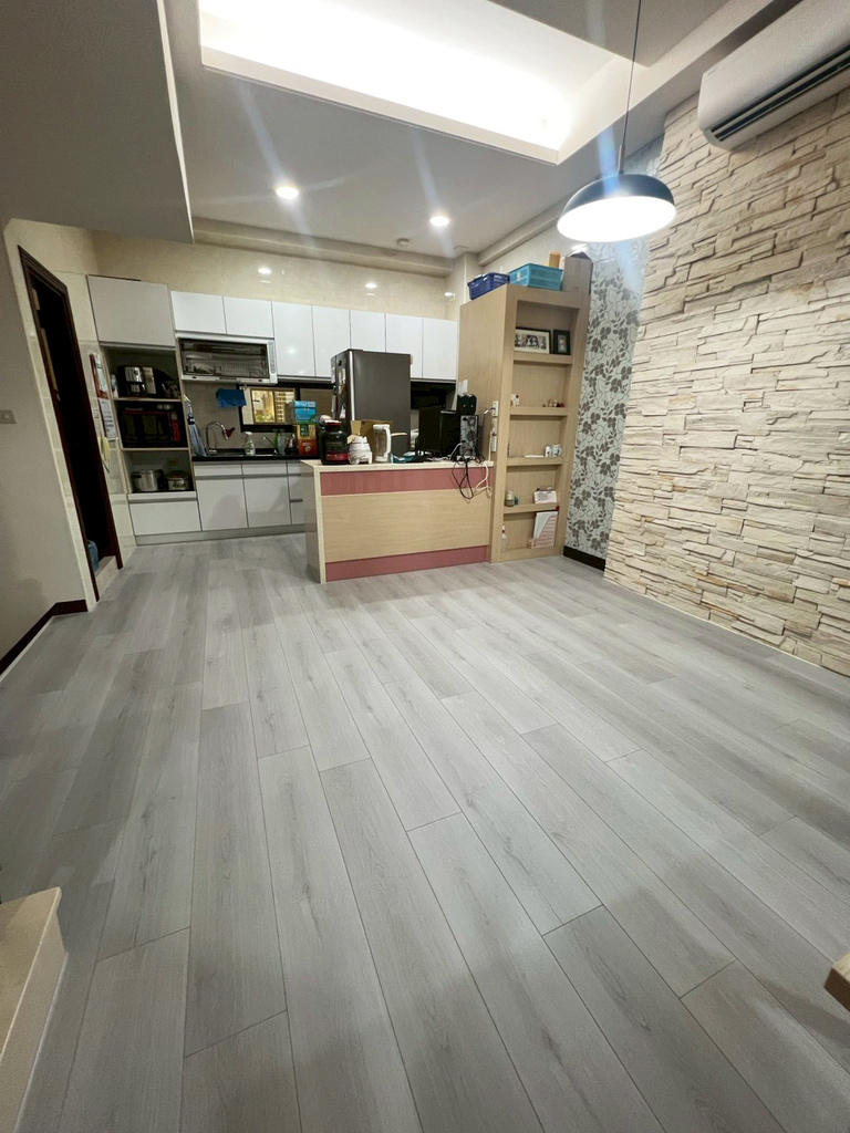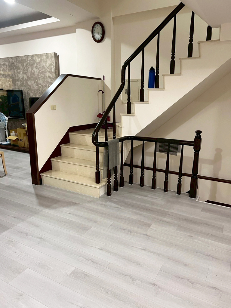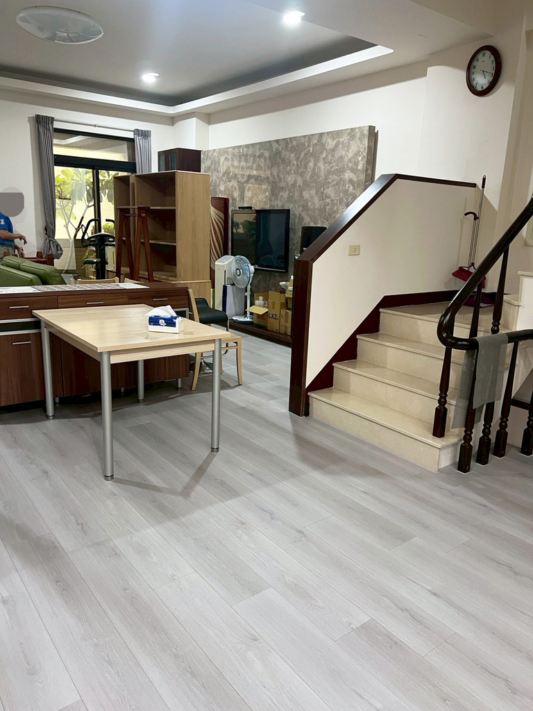 再來,整個家的氣氛真的被拉高了!原本的裝潢看起來有點單薄,但換上木地板後,家具和牆面都變得更有整體感。而且清潔超方便!現在只要吸塵拖一下就很乾淨了。