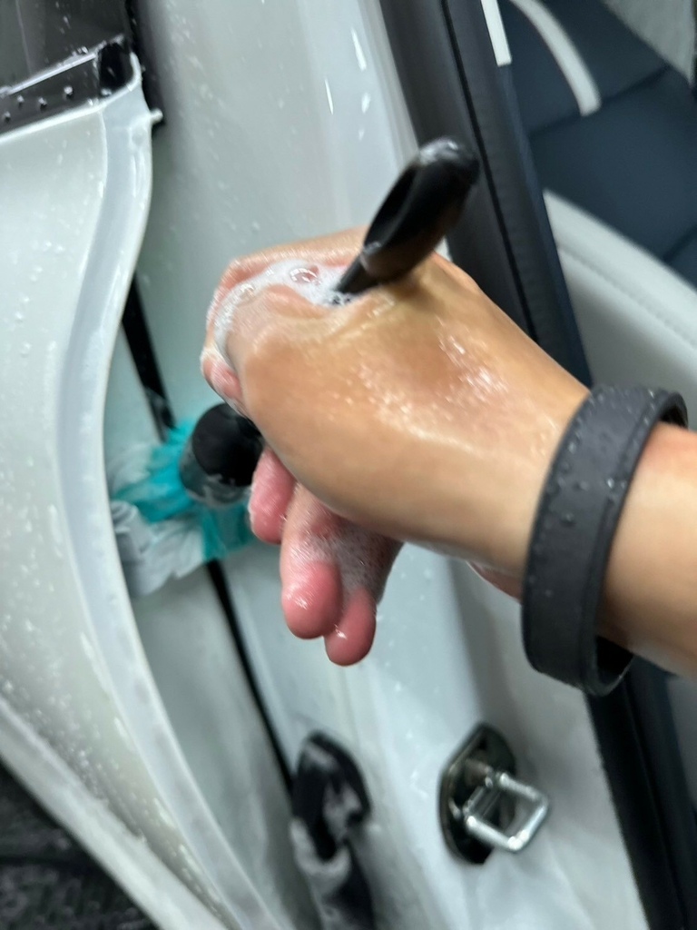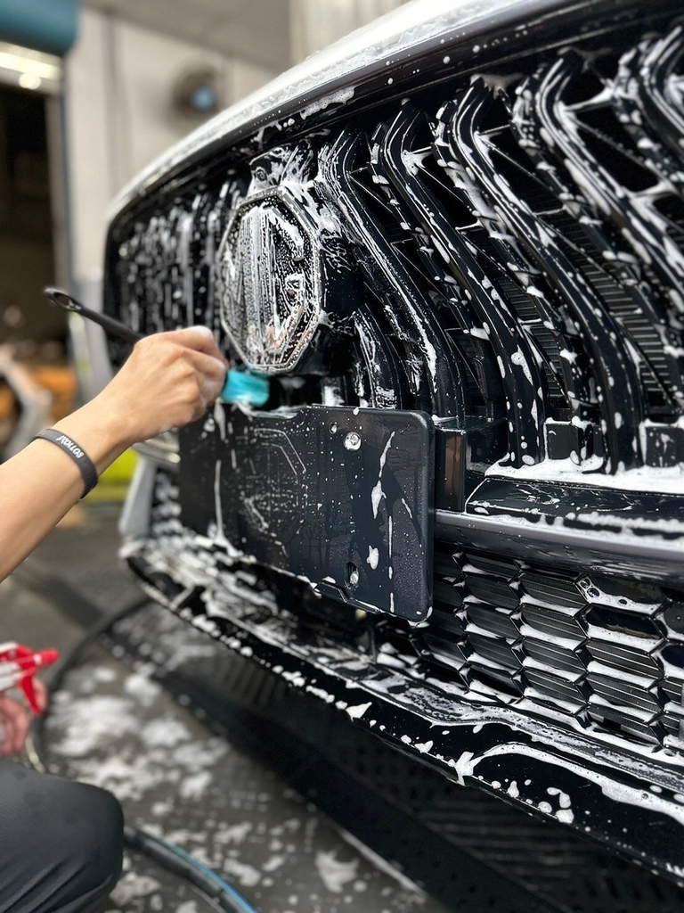 鍍膜前的第一步是徹底清潔車身,師傅們使用專業洗車設備,將車身上的灰塵、泥土和其他髒污清理乾淨,連輪胎縫隙和車身細節都不放過,確保車輛處於最佳狀態,為後續鍍膜做好準備。