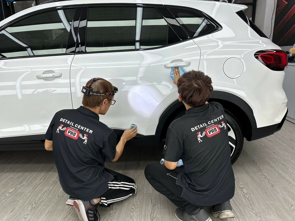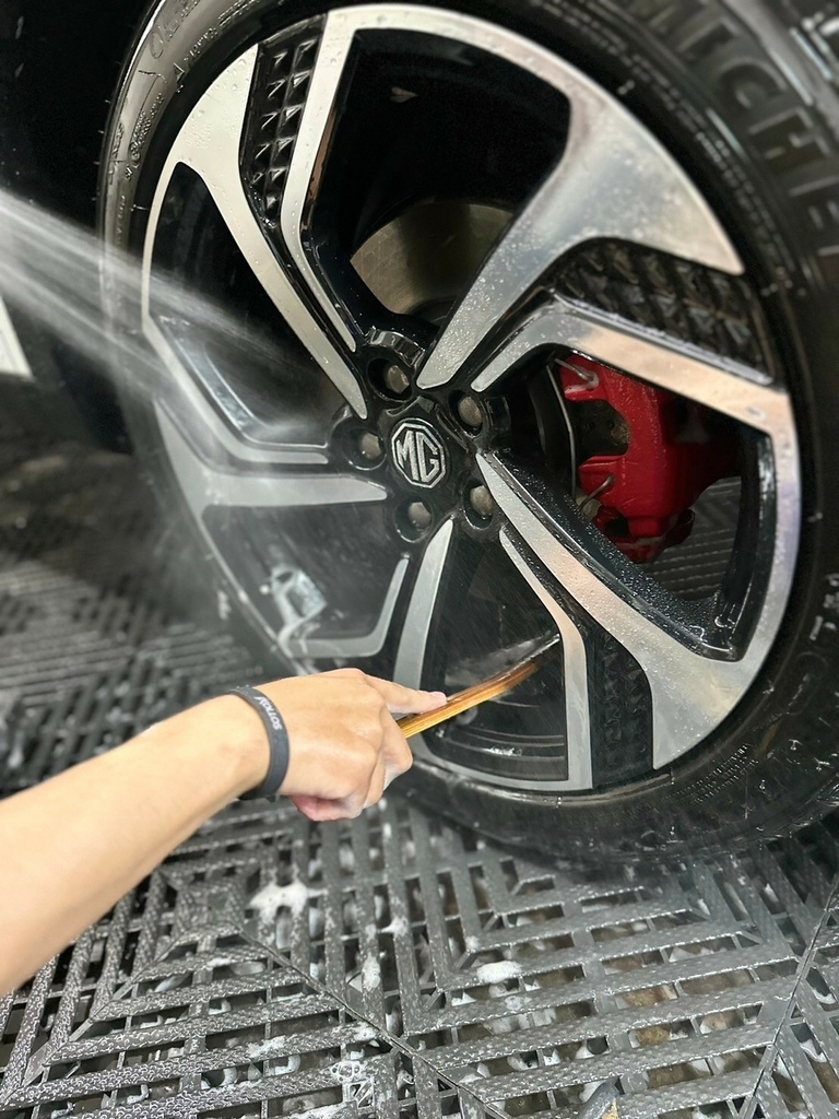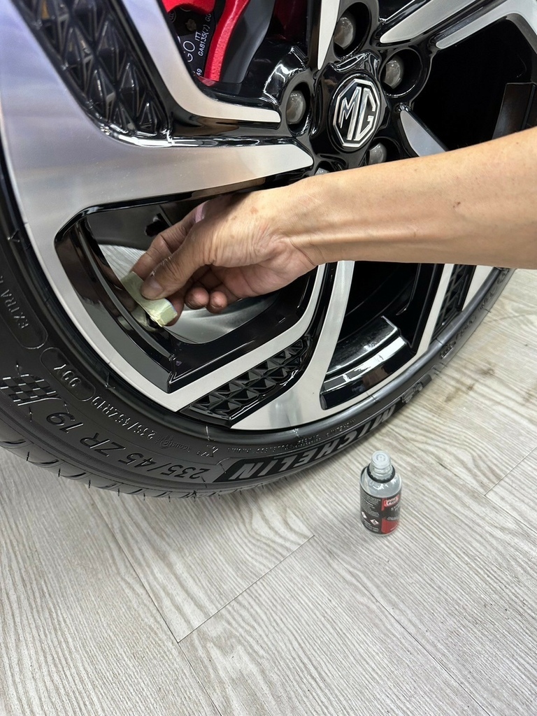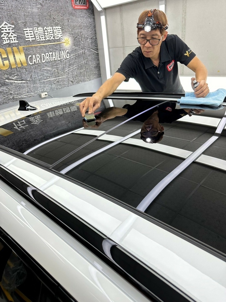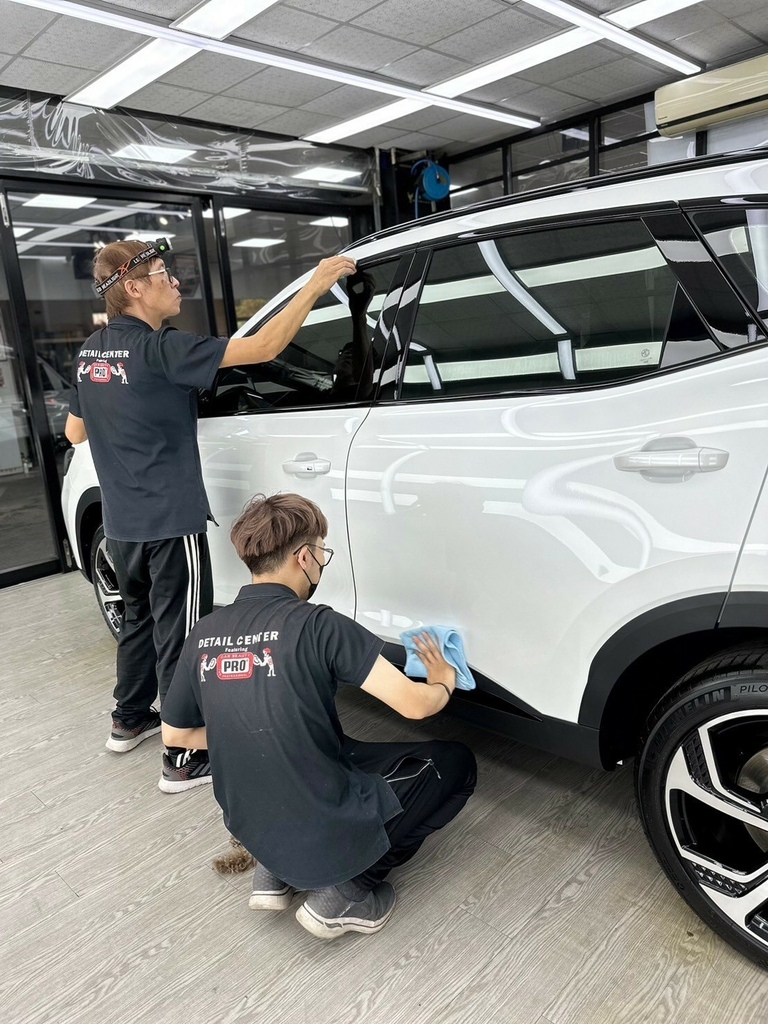 最後,師傅為車身、鋼圈及各項細部進行全面鍍膜施工,包括車漆、輪圈和玻璃等部位。這層保護膜能有效抵禦酸雨、紫外線和日常髒污,讓車身光澤更持久,延長愛車的美觀壽命。