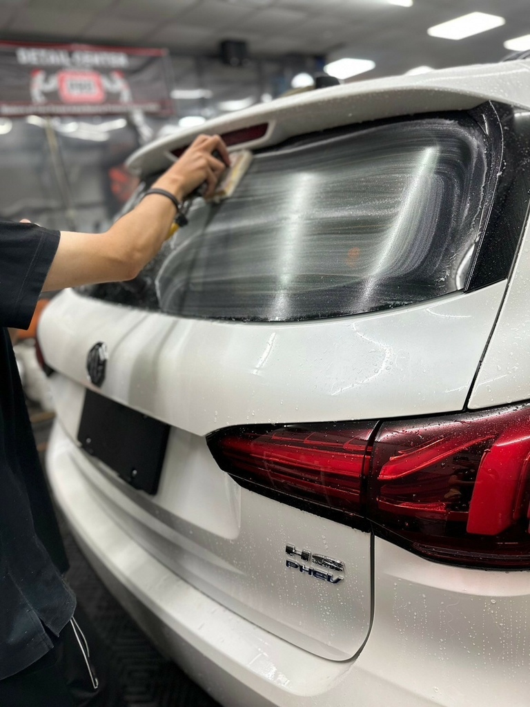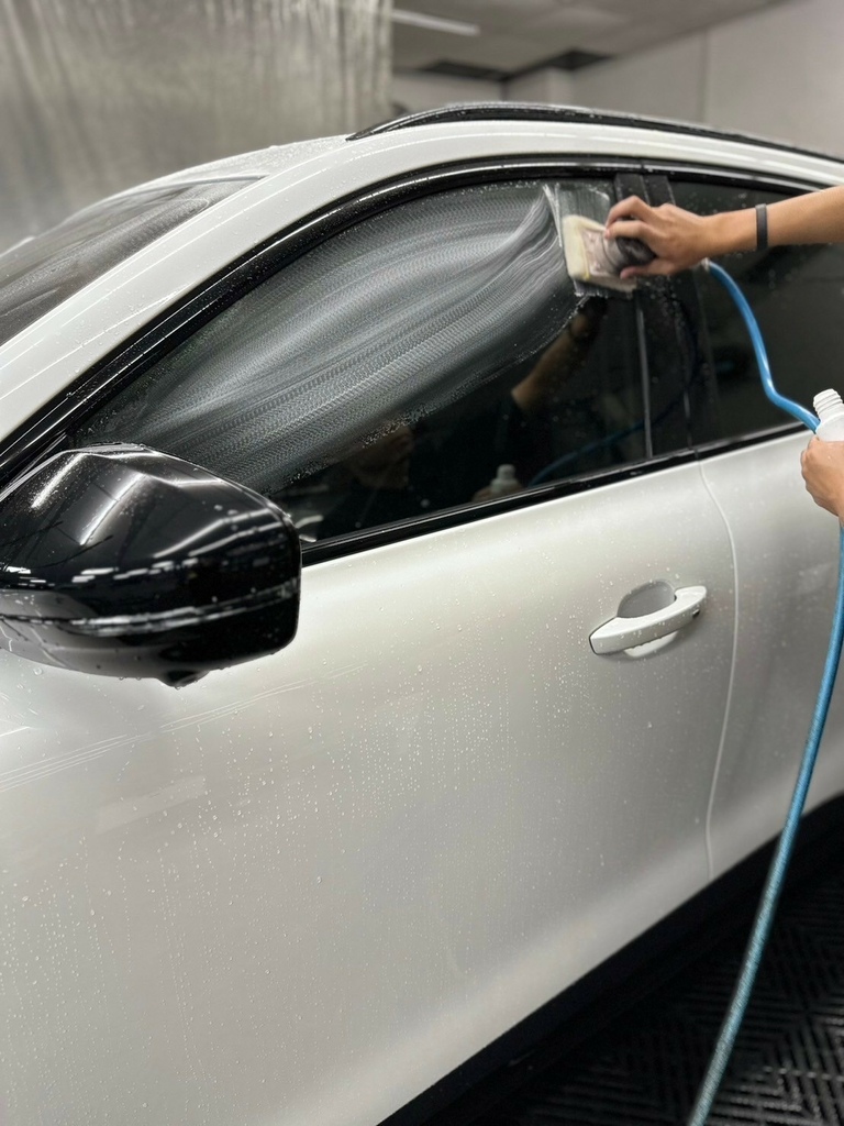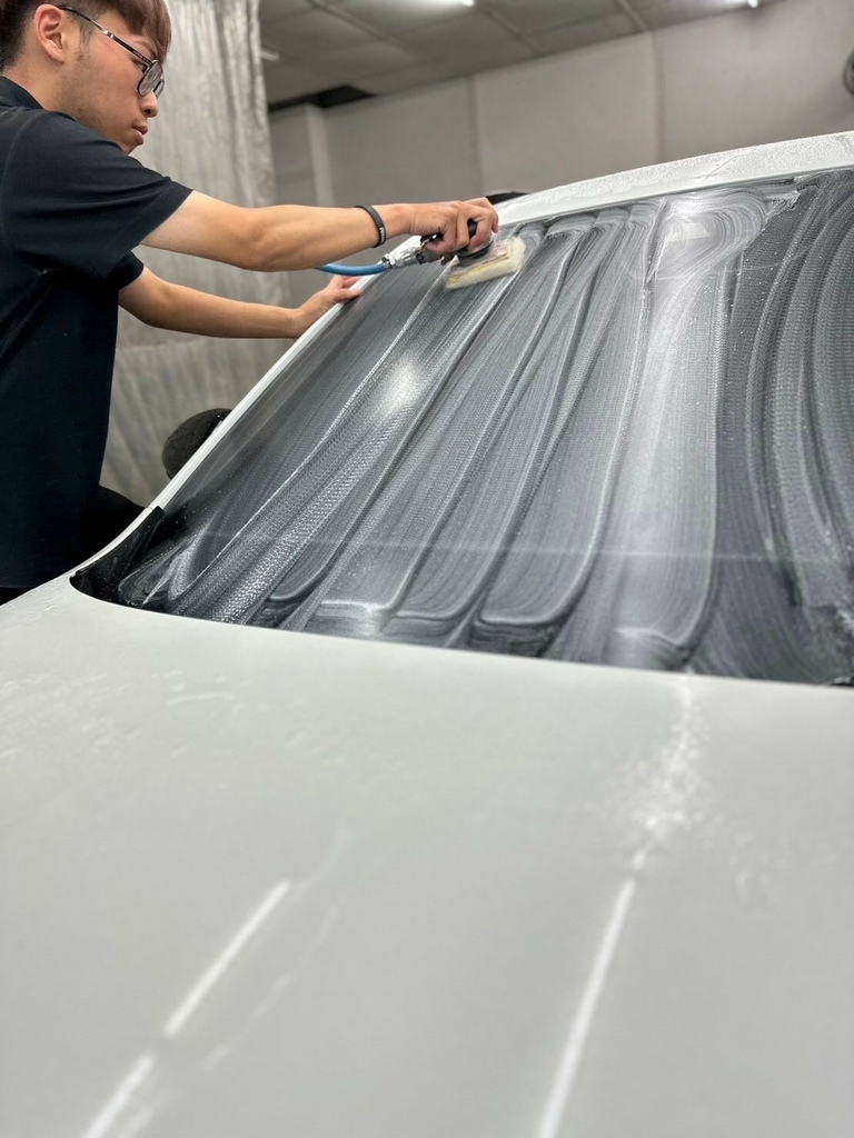 接下來,師傅針對車窗玻璃進行油膜去除處理。這一步能有效清除玻璃上的油污和頑固痕跡,讓玻璃恢復透明,提升駕駛時的視線清晰度,特別是在雨天行駛時效果顯著!