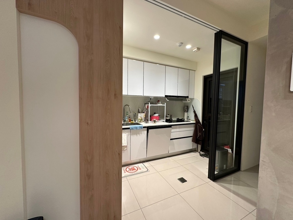原本設計師是想讓客廳和廚房的高度一樣,打造更開闊的視覺感,但因為電梯的限制,鋁框拉門的高度沒辦法做到那麼高,最後決定讓廚房稍微低一點點,然後用清玻璃的鋁框門隔開。這個改動我覺得反而更有層次感,而且透明的玻璃完全不阻礙光線穿透,讓小空間也能有放大的效果。