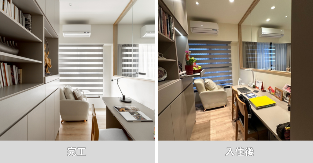 另外,原本計畫放在主臥的行李箱收納櫃,因為尺寸問題最後移到了書房。我覺得這就是好的室內設計價值!遇到限制時靈活調整,找到最適合居住者的方案。