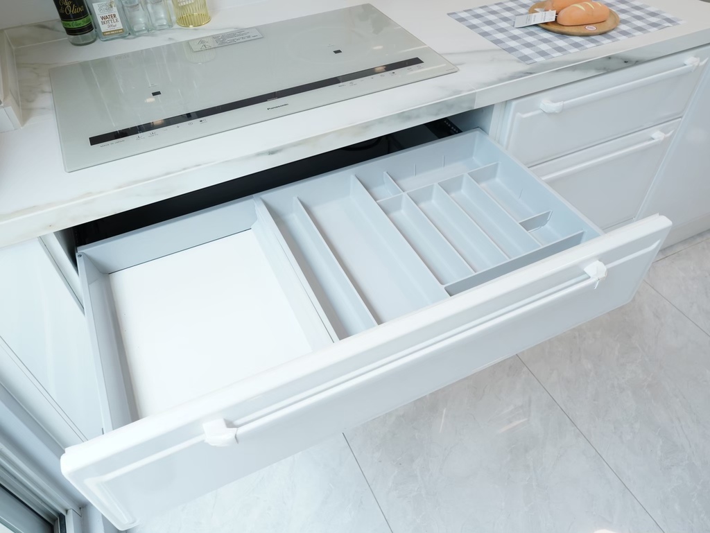 高機能收納設計,抽屜滑順好推好拉、各種大小鍋具都有家。