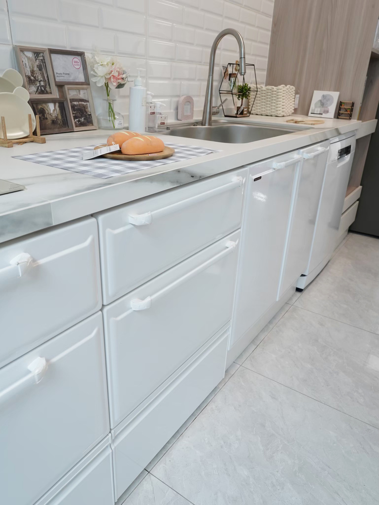 完工後~天啊~白色系廚房好清爽、又浪漫,彷彿可以看見少女心大發的媽媽了❤️ 整個空間瞬間明亮起來,連我自己都想天天待在廚房了!