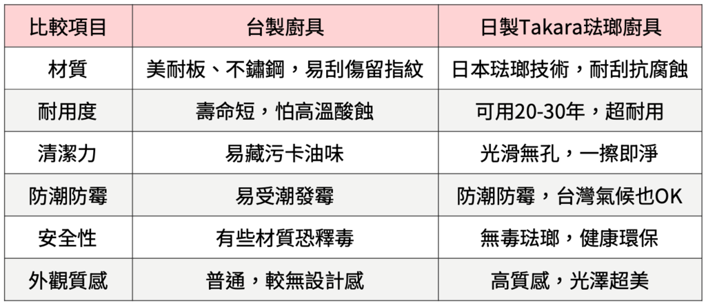 在決定之前,我們當然也比較了市面上常見的台製廚具和Takara琺瑯廚具,雖然台製廚具選擇多也比較經濟實惠,但Takara琺瑯廚具在這些地方真的讓我們心動到不行!